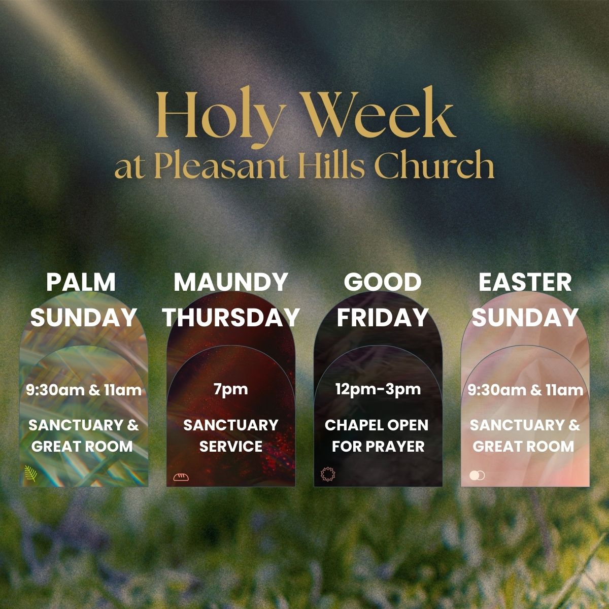 At Pleasant Hills Church, we invite you to experience the power and hope of Easter as we celebrate the resurrection of Jesus. Join us for a meaningful and inspiring Holy Week filled with worship, prayer, and fellowship.